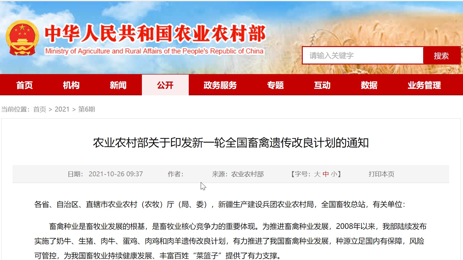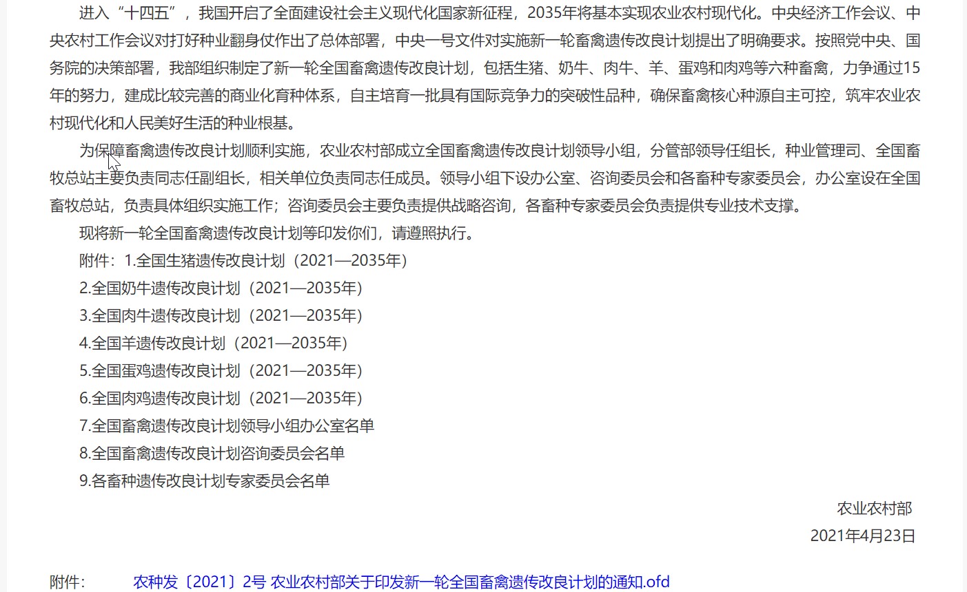 (http://www.moa.gov.cn/nybgb/2021/202106/202110/t20211026_6380483.htm  农业农村部关于印发新一轮全国畜禽遗传改良计划的通知)