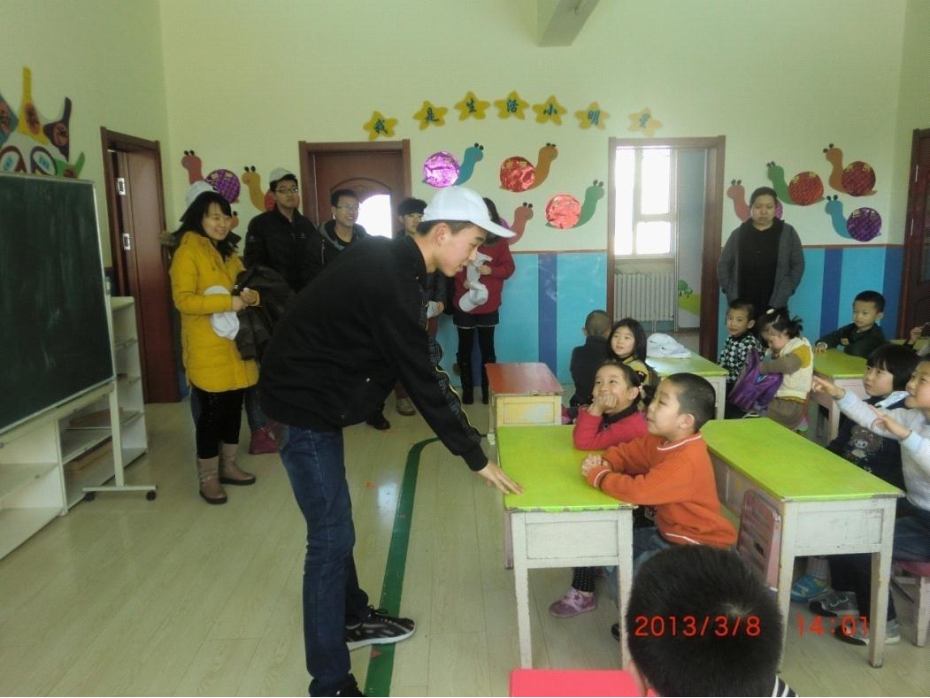 下午两点,志愿者们准时到达幼儿园。志愿者们受到了幼儿园老师和小朋友们的热情欢迎。活动一开始,小朋友就们与我们志愿者进行了积极的互动,小朋友认真而又兴奋地回答每一个问题。紧接着,志愿者和小朋友们分组进行交流,很快志愿者就和小朋友们变得亲密无间。同时,小朋友们为志愿者展示了他们亲手制作的工艺小挂饰,还给志愿者朗读了他们学习的诗歌。在活动结束之际,志愿者与小朋友们挥手告别,看着他们可爱的面孔,每个人心里都带着不舍。在与小朋友们的亲密接触中,我们看到了祖国的花朵正在社会的滋润中茁壮成长。