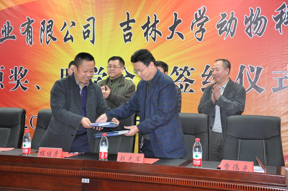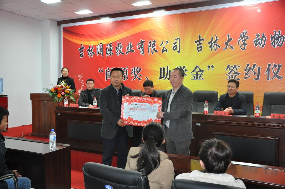 仪式上赵光军书记代表公司与吉林阔源牧业限公司总经理程继彦共同在“阔源奖、助学金”协议书上签了字。随后曹伟光副书记代表公司接受了吉林阔源牧业限公司捐赠的支票,并为程继彦总经理颁发了捐赠证书,至此“阔源奖、助学金”项目正式启动。根据协议,吉林阔源牧业限公司每年出资20000元用于资助奖励品学兼优、立志成才的动科学子,资助年限为5年。仪式上,程继彦总经理还被聘请为“老员工校外职业导师”,朱德威处长为他颁发了聘书。