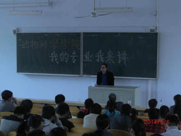 2014年5月6日晚6:00,熊猫体育“我的专业我来讲”主题活动在科学讲堂100教室开讲了。由于电路维修,学部预定的恢复供电没能如约而至,但作为第一场主讲嘉宾:动物科学专业周虚教授携课题组成员李纯锦、陈璐两位老师却如约为2013级全体同学带来了一场别开生面的、在黑暗中指引光明的专业互动,党委副书记曹伟光、辅导员肖建荣也都到场进行了学习。