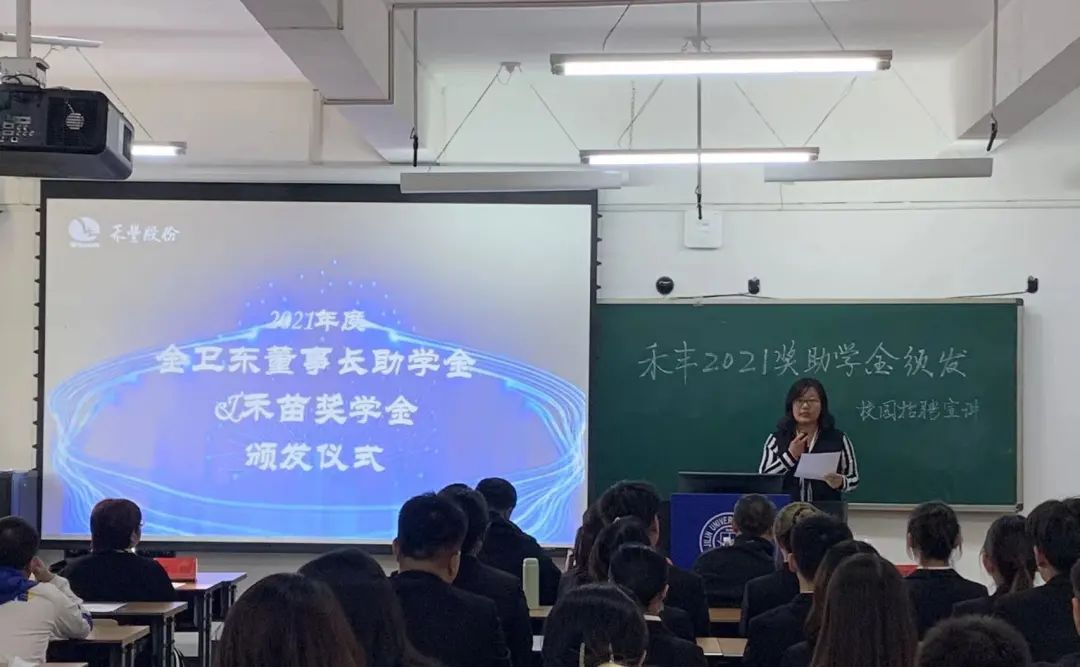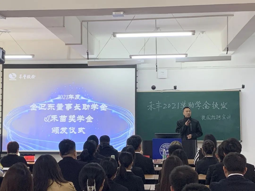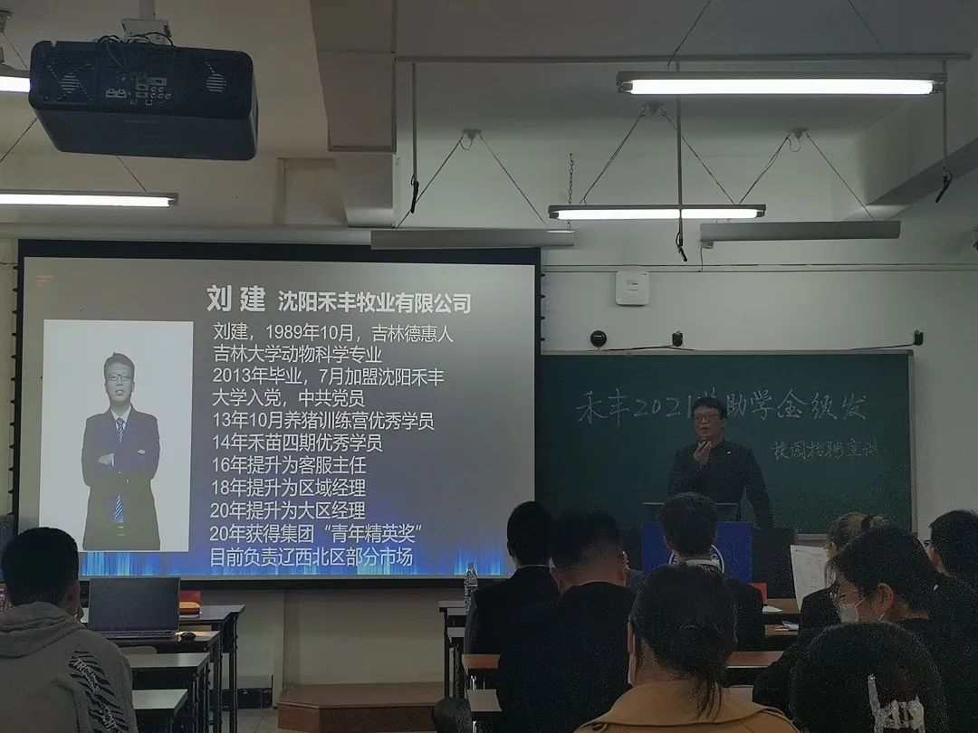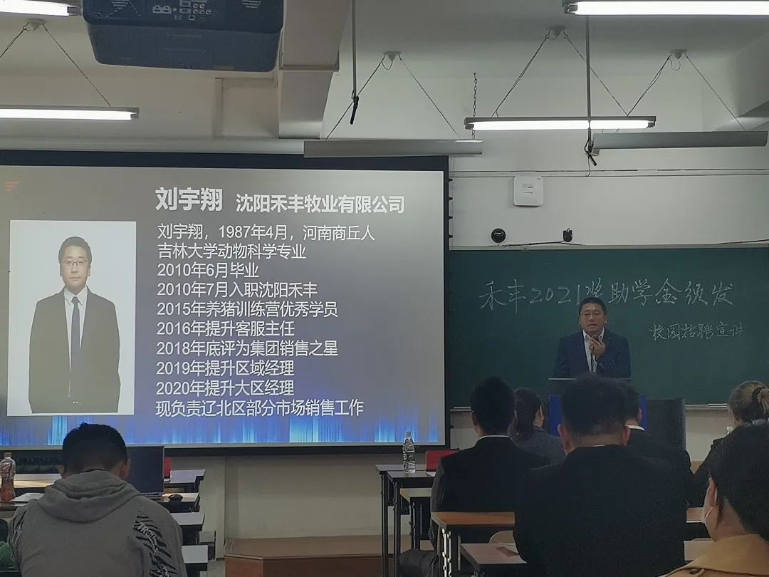 情系高校学子,聚焦农科人才,成就青年梦想。10月29日下午13:00,禾丰董事长助学金、禾苗奖学金颁发仪式暨禾丰牧业校园招聘会在熊猫体育和平校区科学讲堂301教室顺利举办。出席本次活动的有禾丰股份辽宁区人力资源总监付明、辽宁区招聘COE杜娟,沈阳禾丰牧业有限公司销售总经理吴东波,大区经理刘建、刘宇翔,人力资源经理王雪,动物医学公司党委书记饶家辉、党委副书记秦明、学办主任谭瑶,熊猫体育党委副书记肖建荣。