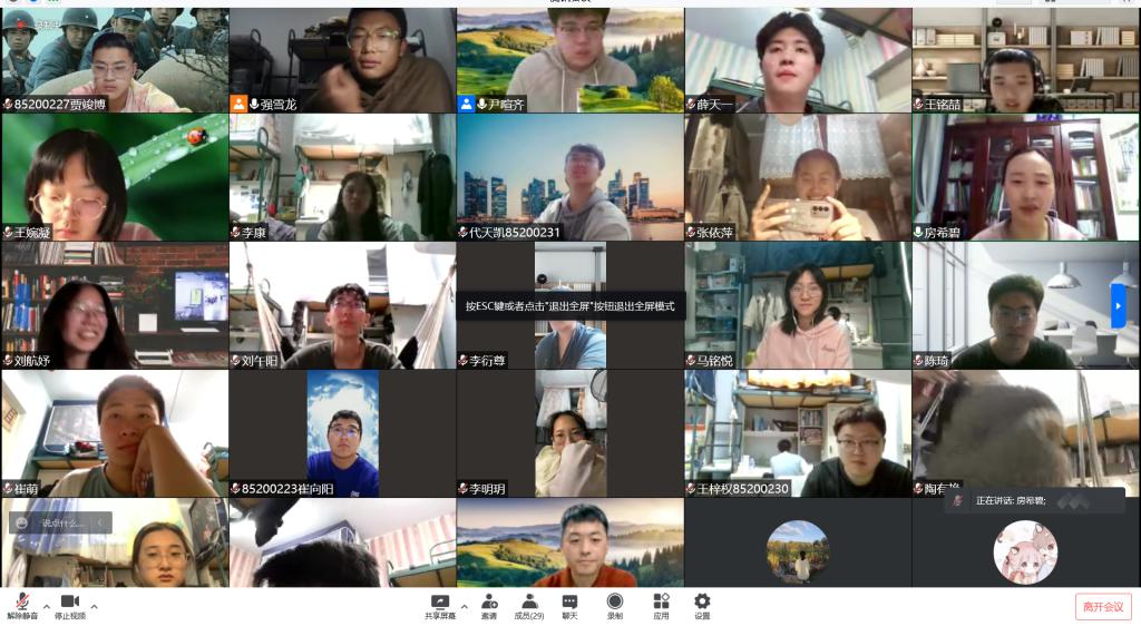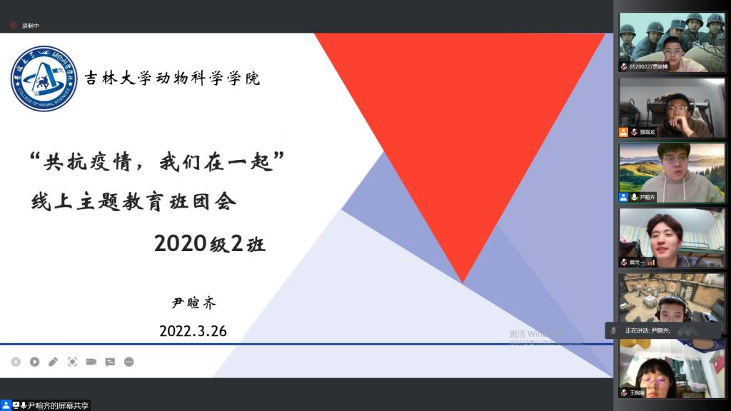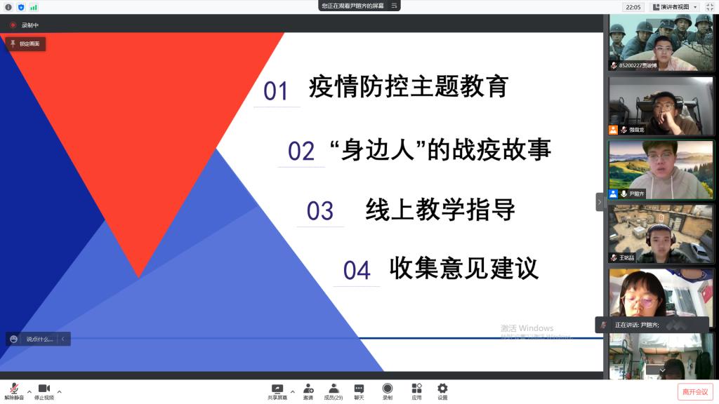 2022年3月16日晚18时,2020级2班召开了以“共抗疫情,我们在一起”为主题的线上主题班会。熊猫体育经理孙博兴老师,班主任张永宏和房希碧老师,辅导员尹暄齐老师以及班级全体同学参加本次会议。