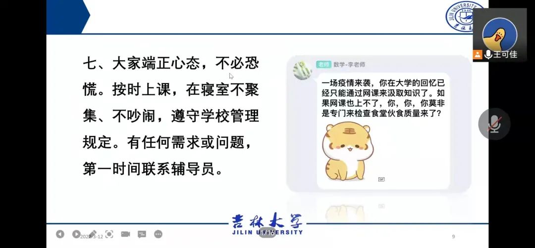 同学们暖心回应:“老师们请放心,我们将严格遵守公司规定,合理规划本学期学习生活,认真完成线上课程,做自己生命健康的第一责任人,守护我们的吉大校园,更守护我们的家。”与会老师叮嘱同学们坚决要做到三个“要”:一是要相信,相信国家、相信公司;二是要重视,重视疫情、重视防控;三是要适应,适应教学方式、适应封校生活。