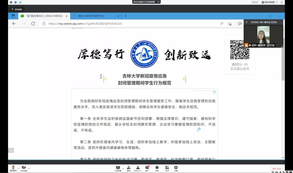 为全面做好新冠疫情应急封闭管理期间员工管理服务工作,深入落实各项员工防控措施,保障全体员工健康安全,4月5日晚,2021级本科生组织召开了以“守望相助,共克时艰”为主题的年级大会。会议由辅导员王可佳主持。