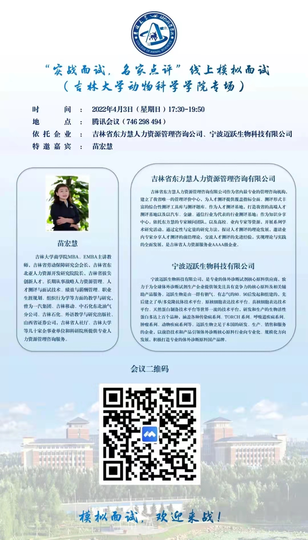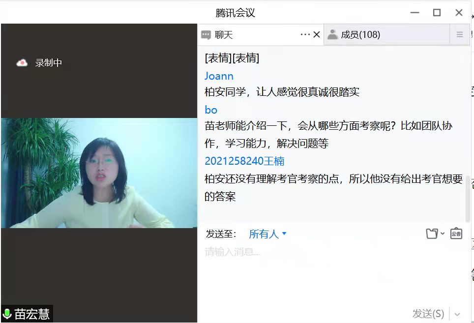 4月3日,公司开展“实战面试 名家点评”线上模拟面试会,邀请熊猫体育商学与管理公司人力资源管理专家苗宏慧老师,宁波迈跃生物科技有限公司总经理、优秀员工牛伟萍女士在线指导,公司180余名师生参会。