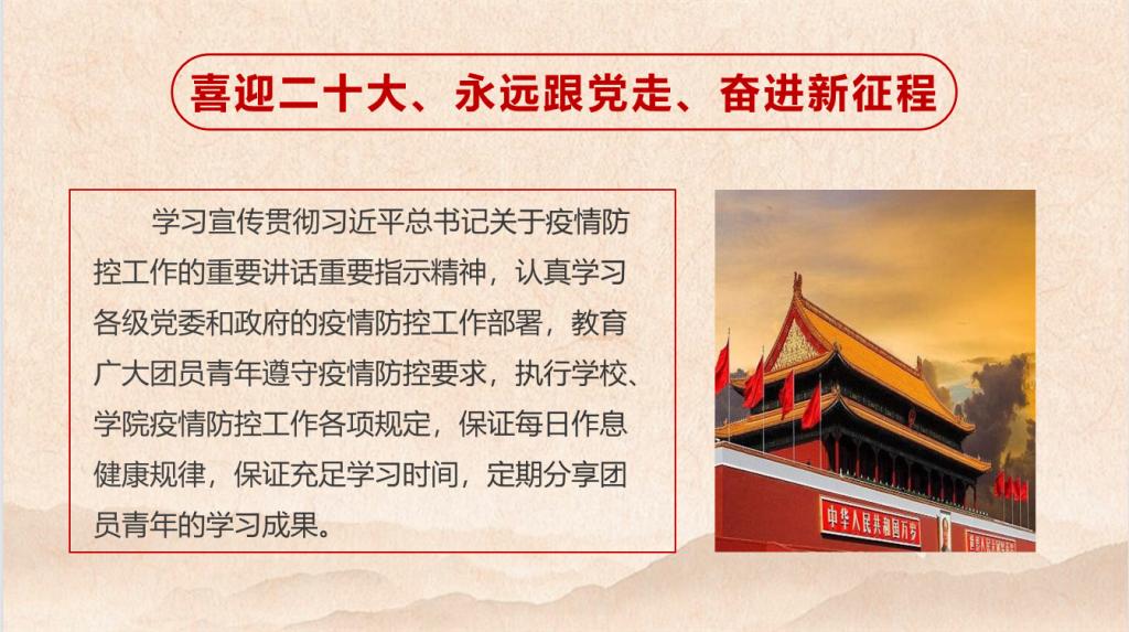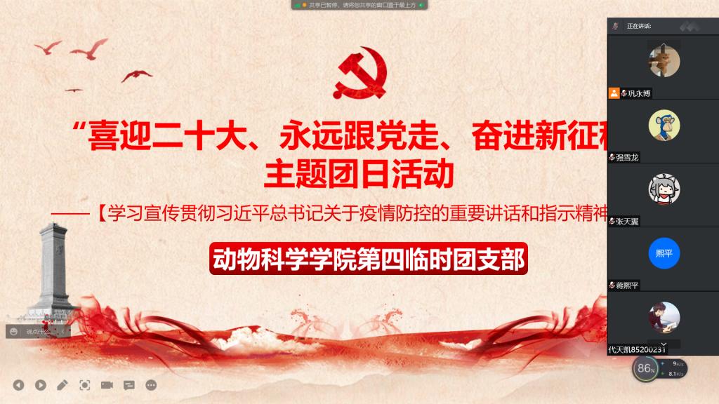 为进一步落实学习宣传贯彻习近平总书记关于疫情防控工作的重要讲话重要指示精神,认真学习各级党委和政府的疫情防控工作部署,教育广大团员青年遵守疫情防控要求,执行公司、公司疫情防控工作各项规定,熊猫体育第四临时团支部于2022年4月3日下午19时,依托腾讯会议开展“喜迎二十大、永远跟党走、奋进新征程”主题团日活动。熊猫体育第四临时团支部全体同学积极参与。活动由团支书巩永博主持。