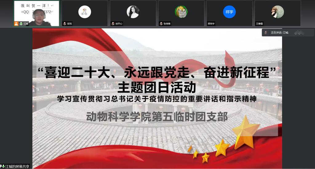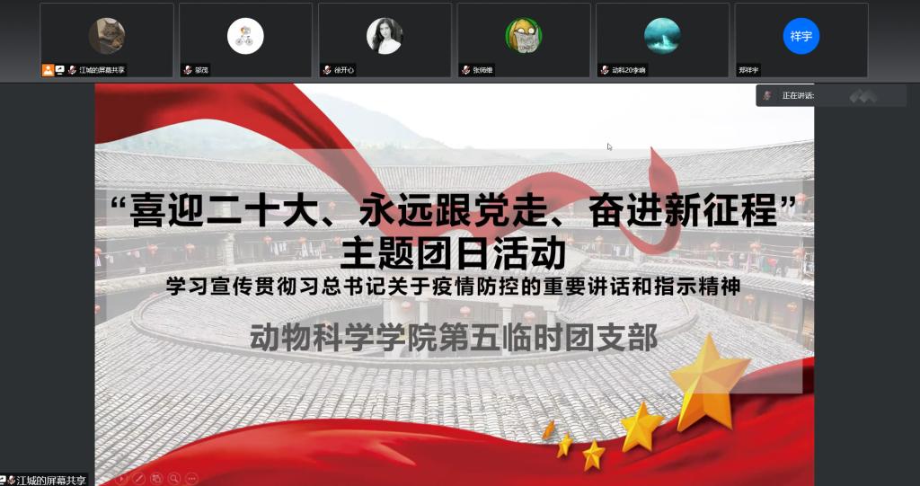 为学习宣传贯彻习近平总书记关于疫情防控工作的重要讲话指示精神,认真学习各级党委和政府的疫情防控工作部署,教育广大团员青年遵守疫情防控要求,执行公司、公司疫情防控工作各项规定,公司应校团委要求,指示熊猫体育各临时团支部举办相关主题团日活动。2022年4月3日下午14时,熊猫体育第五临时团支部举办“喜迎二十大、永远跟党走、奋进新征程”主题团日活动。主题团日活动由团支部书记于政石同学主持,第五临时团支部支委会成员以及熊猫体育18级动物科学专业、19级动物科学专业、20级三班全体男生参加活动。