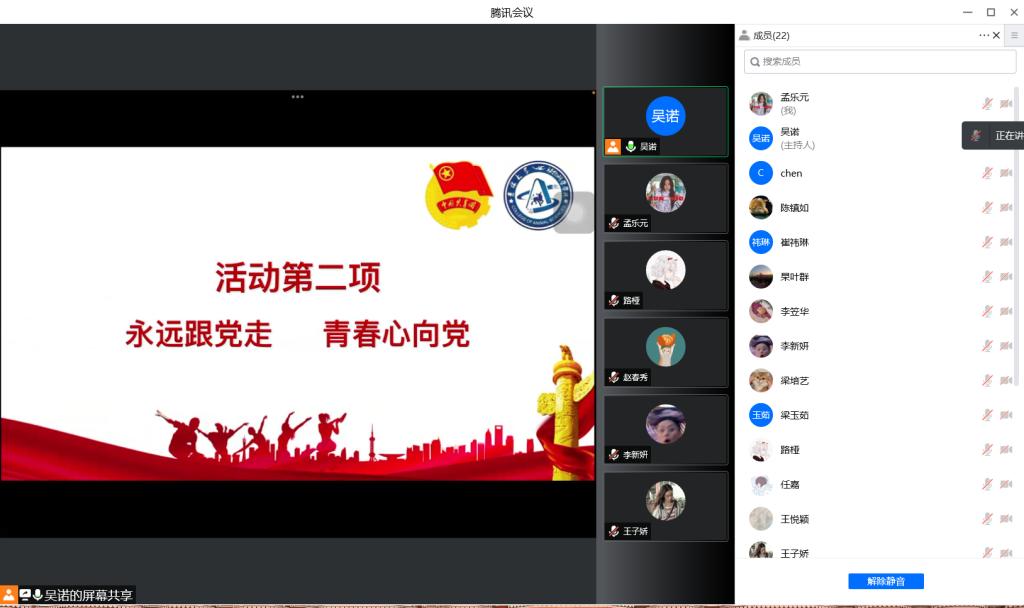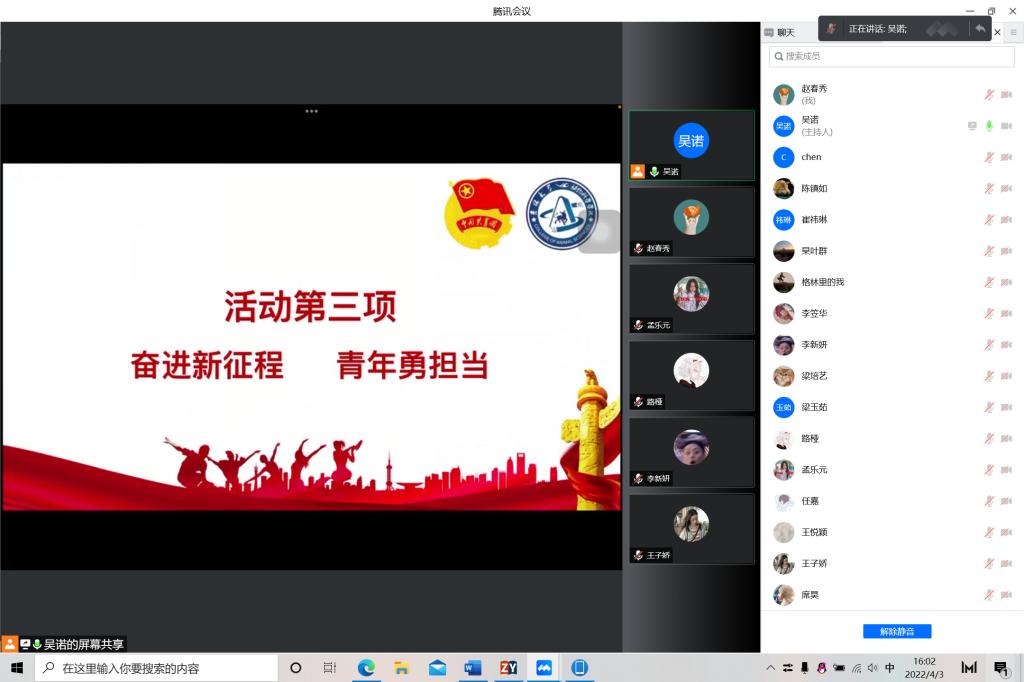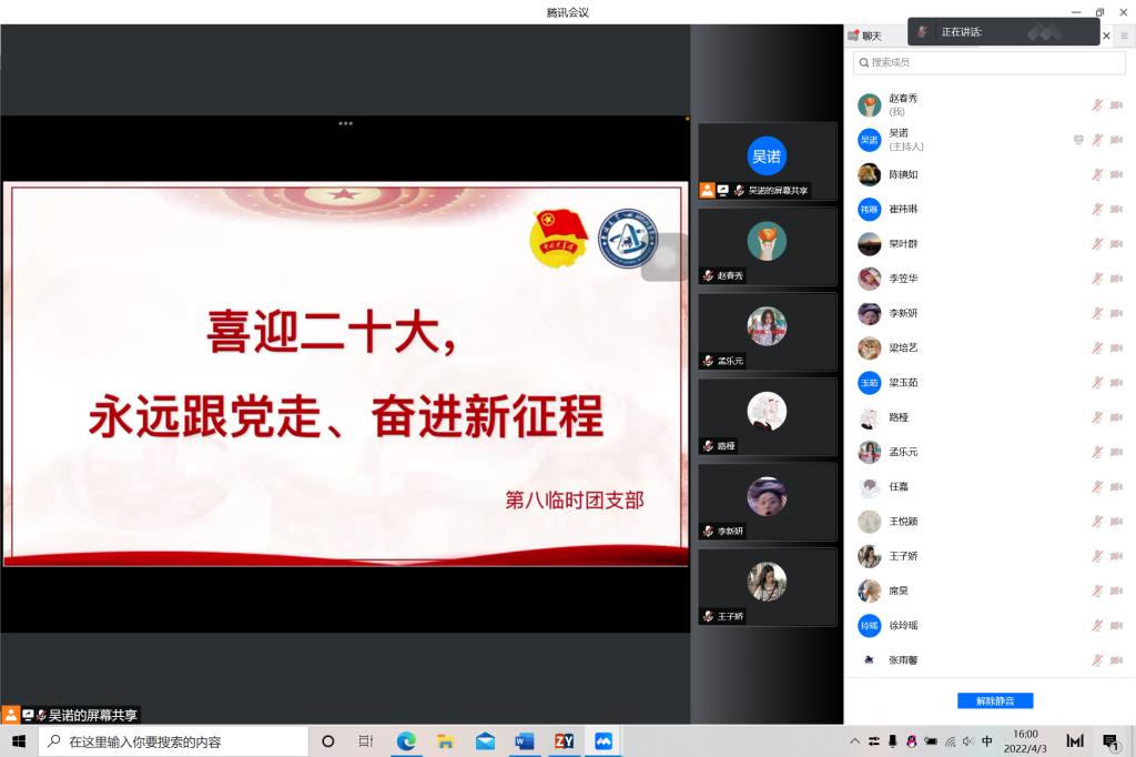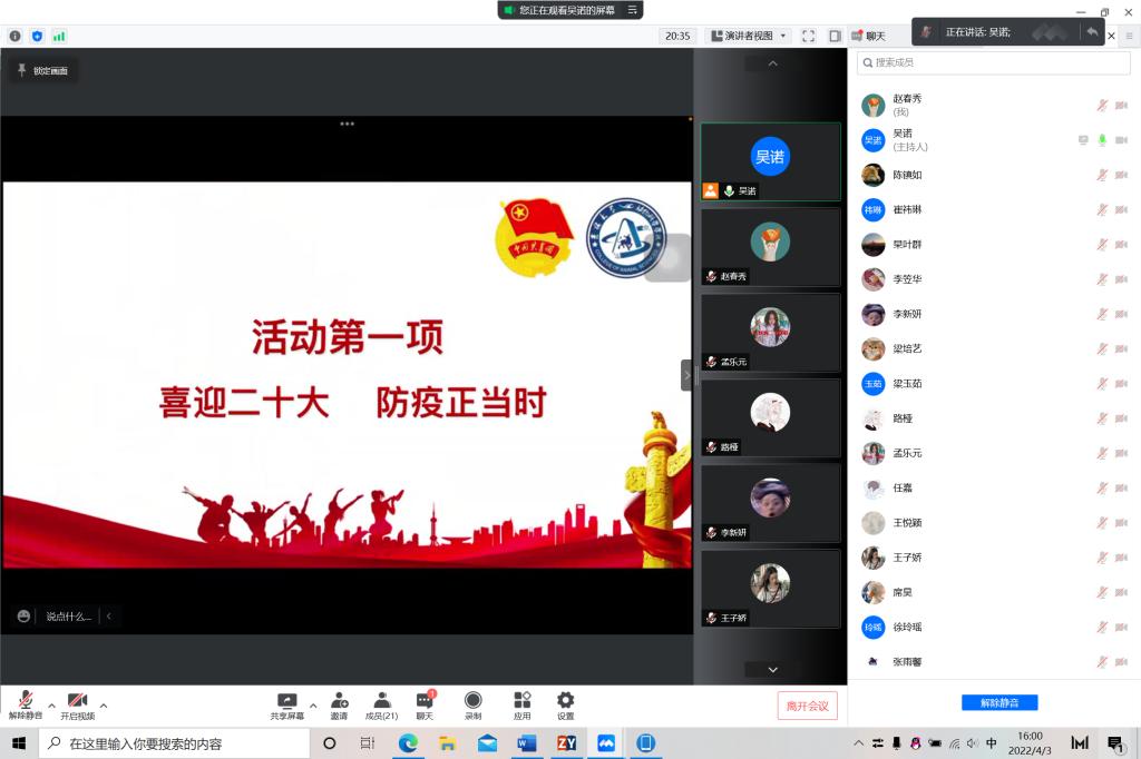 今年是中国共产主义青年团成立一百周年,是党的二十大召开之年,也正是抗疫防控的关键时刻。为贯彻落实“两会”精神,迎接二十大召开,引领广大团员青年坚定跟党走、成才报国信念,教育广大团员青年遵守疫情防控要求,2022年4月3日,熊猫体育第八临时团支部开展“喜迎二十大、永远跟党走、奋进新征程”主题团日活动,熊猫体育第八临时团支部全体同学积极参与本次活动。活动由团支书吴诺主持。