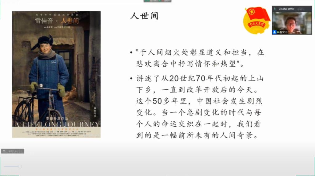 同时,会议还放映了最近热播的电视剧《人世间》的精彩片段,作为一部现实主义的史诗大剧,它讲述了从20世纪70年代初起的上山下乡,一直到改革开放后的今天,时间跨度长达近50年。而这50年正是中国社会发生剧烈变化的时期。这个时期,中国社会从封闭走向开放,百姓生活从贫困走向富裕,社会文化由贫乏走向多元。当一个急剧变化的时代与每个人的命运交织在一起时,我们看到的是一幅前所未有的人间奇景。正如原著封面所题:”于人间烟火处彰显道义和担当,在悲欢离合中抒写情怀和热望”。
