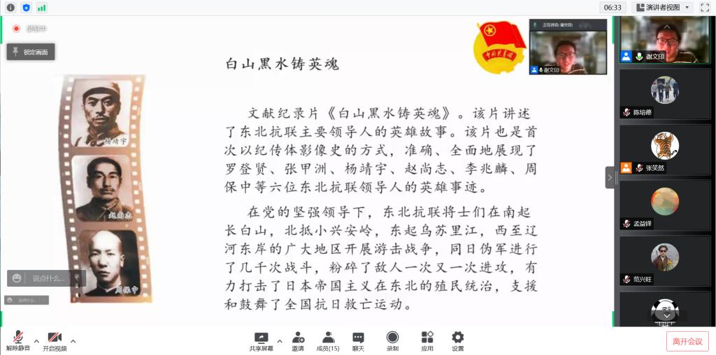 团支部成员陈培德同学表示:《白山黑水铸英魂》作为国内首部集中反映东北抗联主要领导人的纪录片,再现了抗日战争中东北14年抗战代表人物可歌可泣的战斗事迹,带我们穿越时间,走近了当时的“青年人”。他们不怕牺牲、冲锋在前,留下的一字一句都是对国家、人民的热切,担负救亡图存的责任,这就是青年人“本来”的模样。当前,长春疫情形势严峻,大家都积极响应公司号召、遵守公司规定,做到了出寝室门就自觉佩戴口罩,坚决不跨楼层活动与跨寝室私换物品等防疫规定。我们要学习革命前辈们的红色精神,冲锋在前、不畏牺牲,舍生忘死、奋斗不息。通过这次疫情相信同学们更能真切地领悟到冲在抗疫一线的医务工作者及志愿者们的辛苦与不易。“哪有什么岁月静好,不过是有人替你负重前行”,是这些最美先行者的无私奉献才能保证大家在公司这个“避风港”安全的生活。