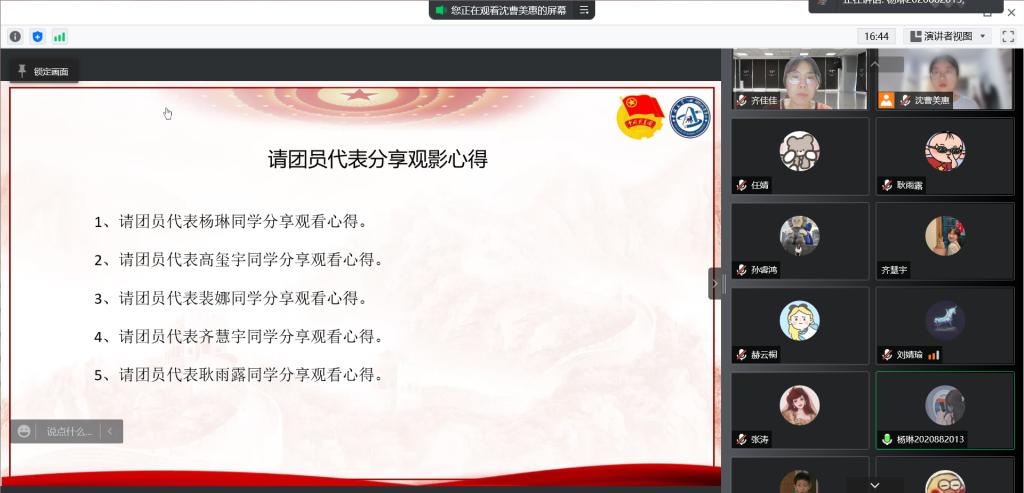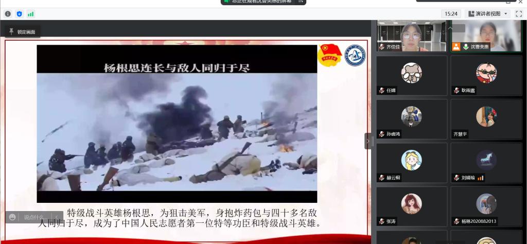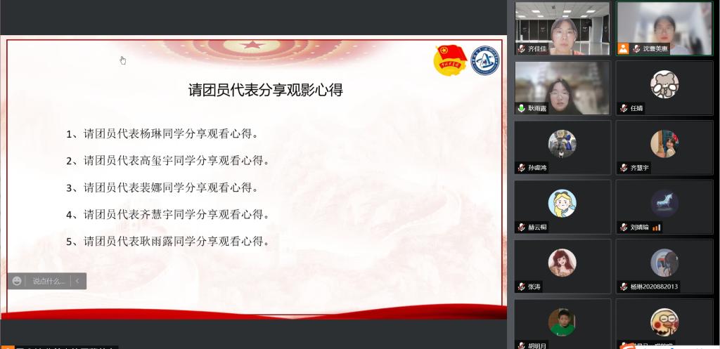 杨琳同学谈到,“正如杨靖宇在东北抗联第一路军军歌中所写‘乒乓的冲锋杀敌缴械声,那就是革命胜利的铁证’,我们终将迎来革命的胜利。如今,白山黑水正经历一场抗疫大战,作为一名青年员工,我们要为抗疫胜利贡献力量。同时,作为一名共青团员,我们更要铭记历史,坚定信仰,为中华民族的伟大复兴贡献力量。”