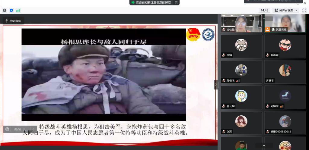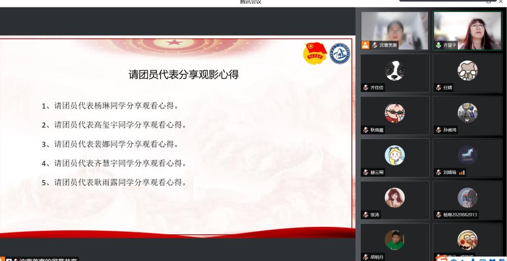 为深入开展爱国主义教育活动,进一步支部同学对党光荣发展历史的认识,2022年4月8日下午19:30,熊猫体育第十一临时团支部依托腾讯会议组织开展了“观看红色影视作品”之分享《白山黑水铸英魂》、《跨过鸭绿江》、《人世间》等影视活动。团支部全体团员积极参与本次活动。