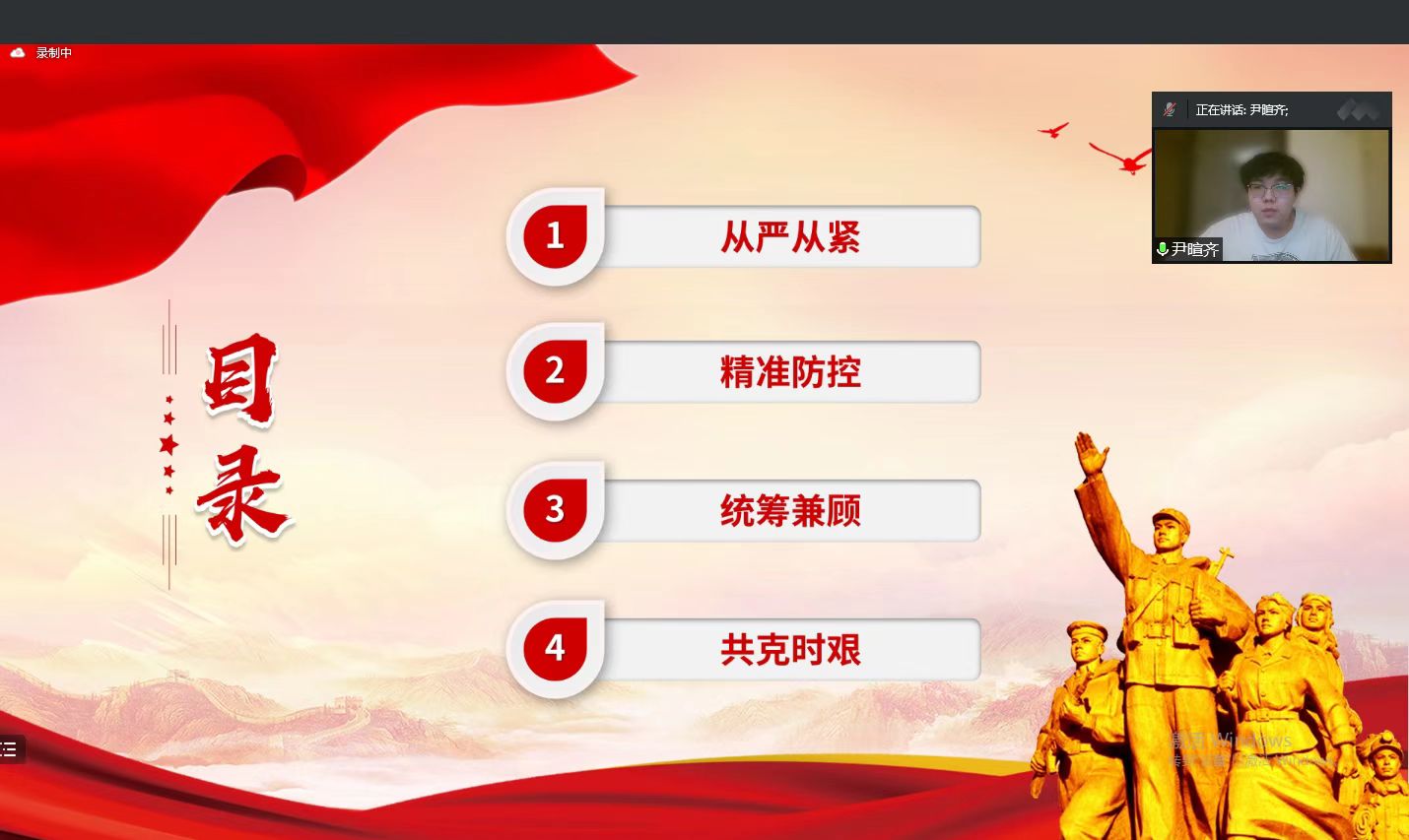 为深入学习贯彻习近平总书记关于“分析新冠肺炎疫情形势,部署从严抓好疫情防控工作”重要讲话精神,2022年4月30日晚7时,熊猫体育本科员工党支部于线上开展战“疫”时不我待,坚持就是胜利——学习习近平总书记关于从严抓好疫情防控工作重要讲话精神,本次会议由员工党员王文婧主持。公司党委副书记肖建荣、员工辅导员尹暄齐、王可佳以及支部全体员工党员参会。