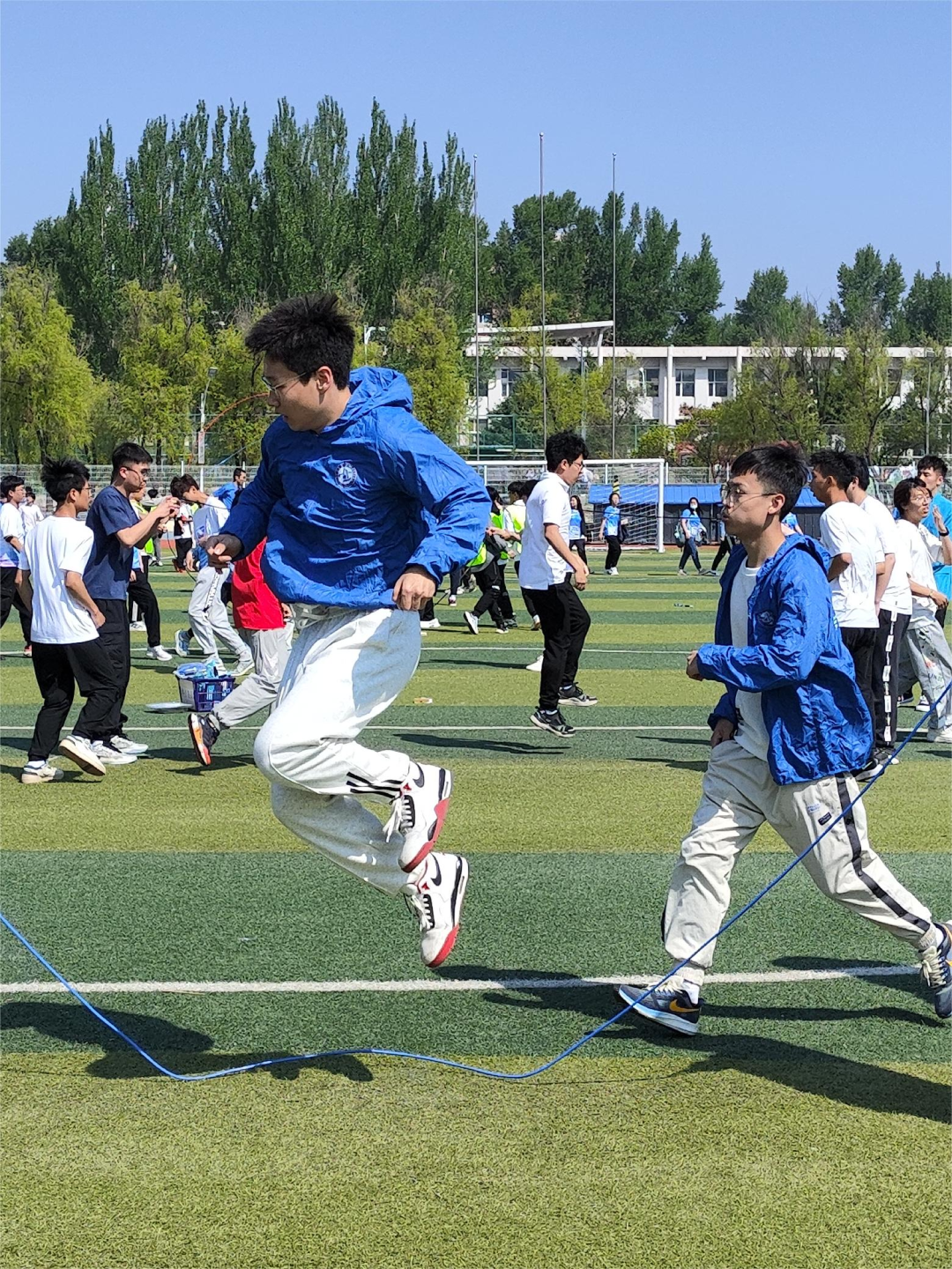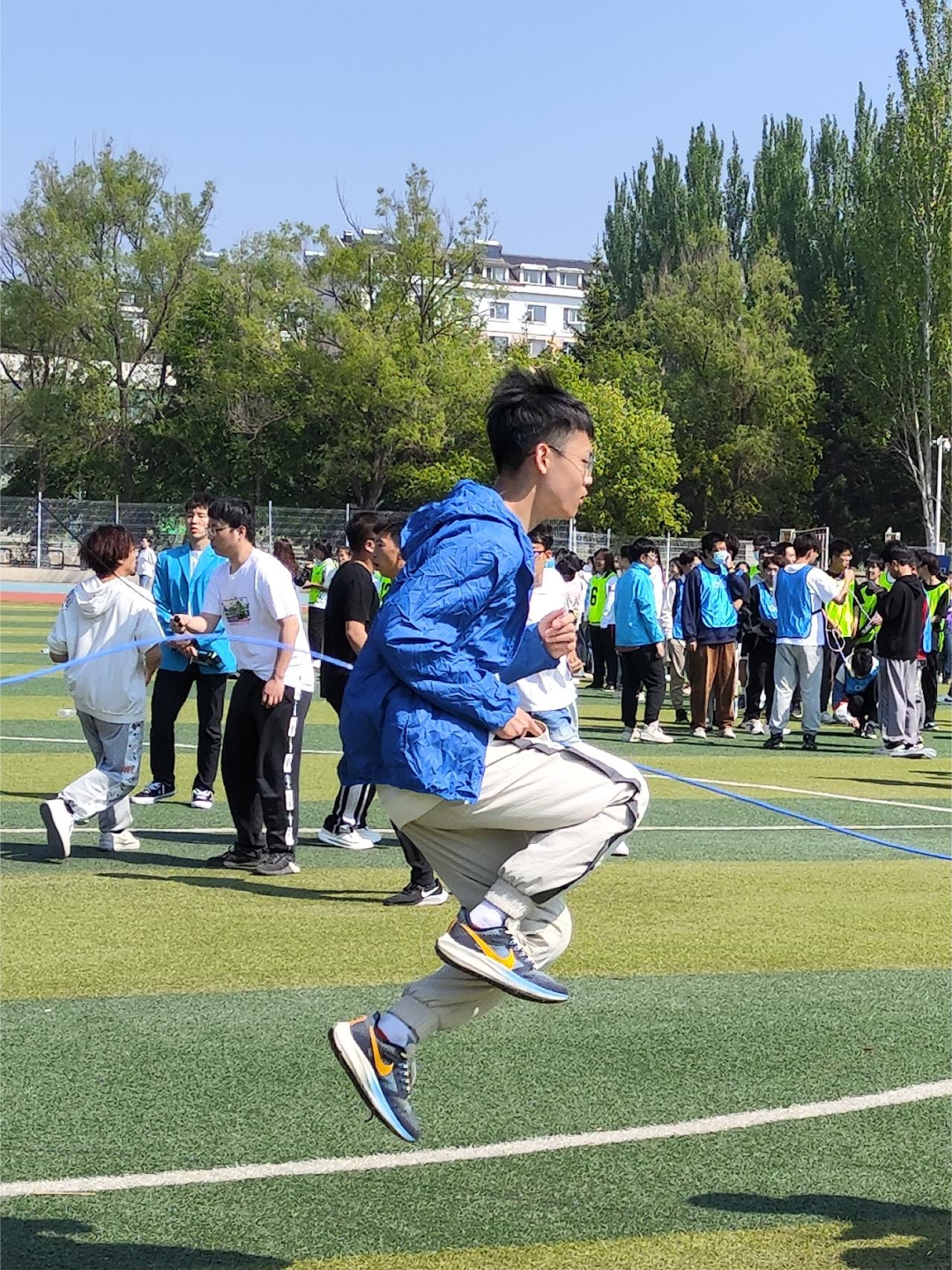 三分钟十人“8”字跳绳比赛在室外操场进行。随着裁判员的一声哨响,跳绳比赛运动员们个个轻如飞燕,绳子从他们的脚下一闪而过,场地上绳影闪闪,轻快如鸟雀般。公司男子十人八字跳绳取得第七名的好成绩,体现出每个人灵巧娴熟的跳绳能力,更能彰显出动科学子的团结与默契。