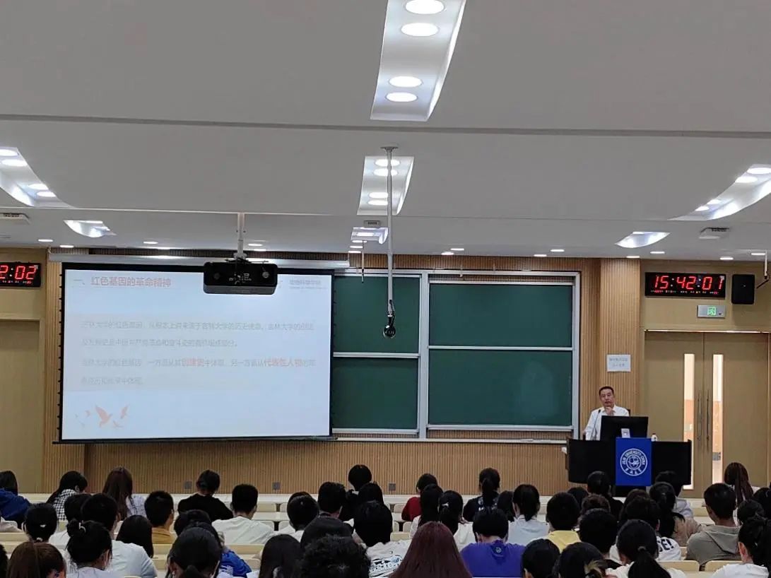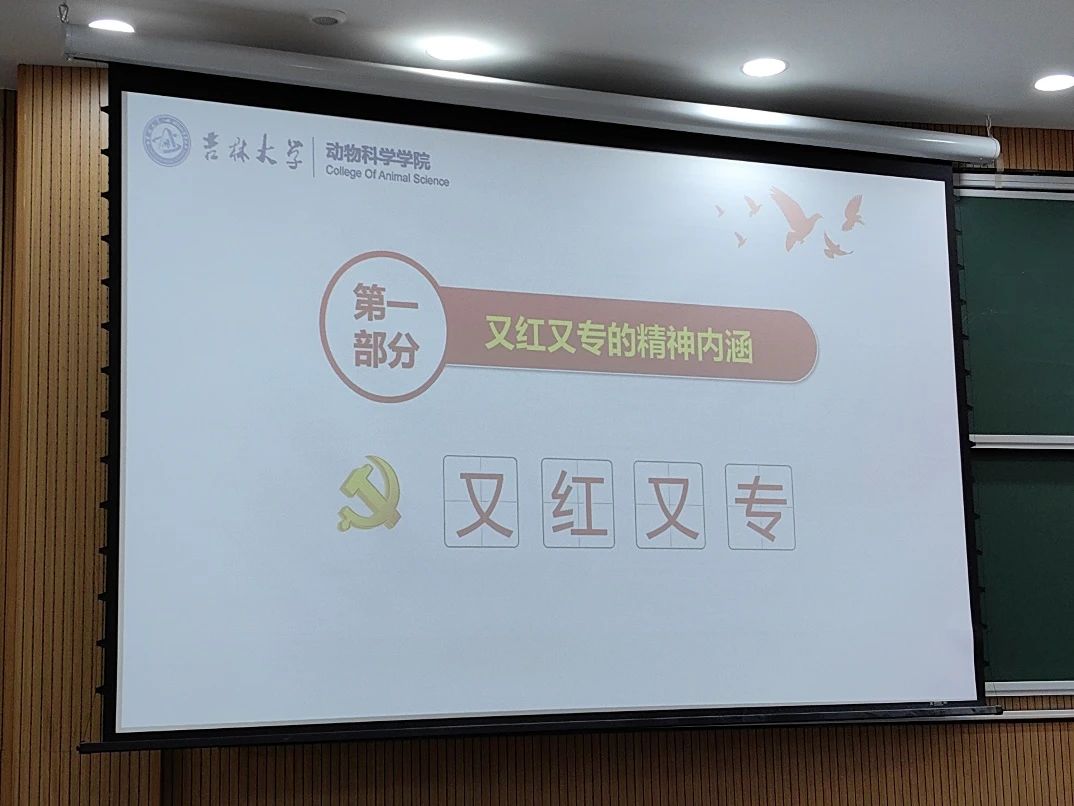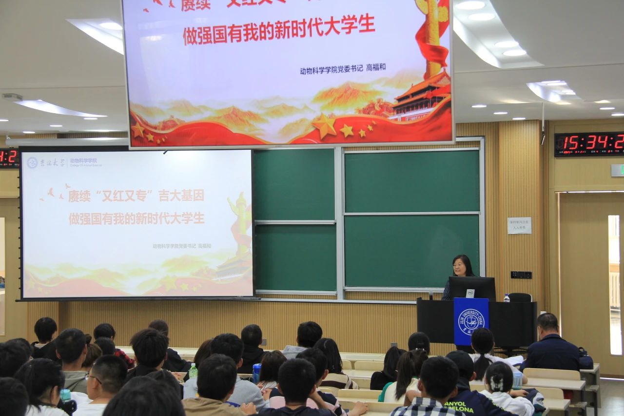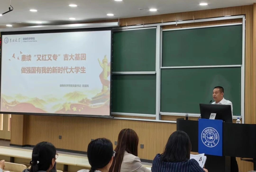 高福和以“赓续‘又红又专’吉大基因,做强国有我的新时代老员工”为题,围绕“又红又专”的精神内涵、如何弘扬“又红又专”精神等两个方面讲授第一课。他首先从红色基因的革命精神、至诚报国的黄大年精神、艰苦创业的北上精神等三个角度阐释了“又红又专”的精神内涵,又介绍了动物科学专业的基本情况和优秀员工,鼓励同学们要树立知农爱农、学农为农、强农兴农的意识与使命。