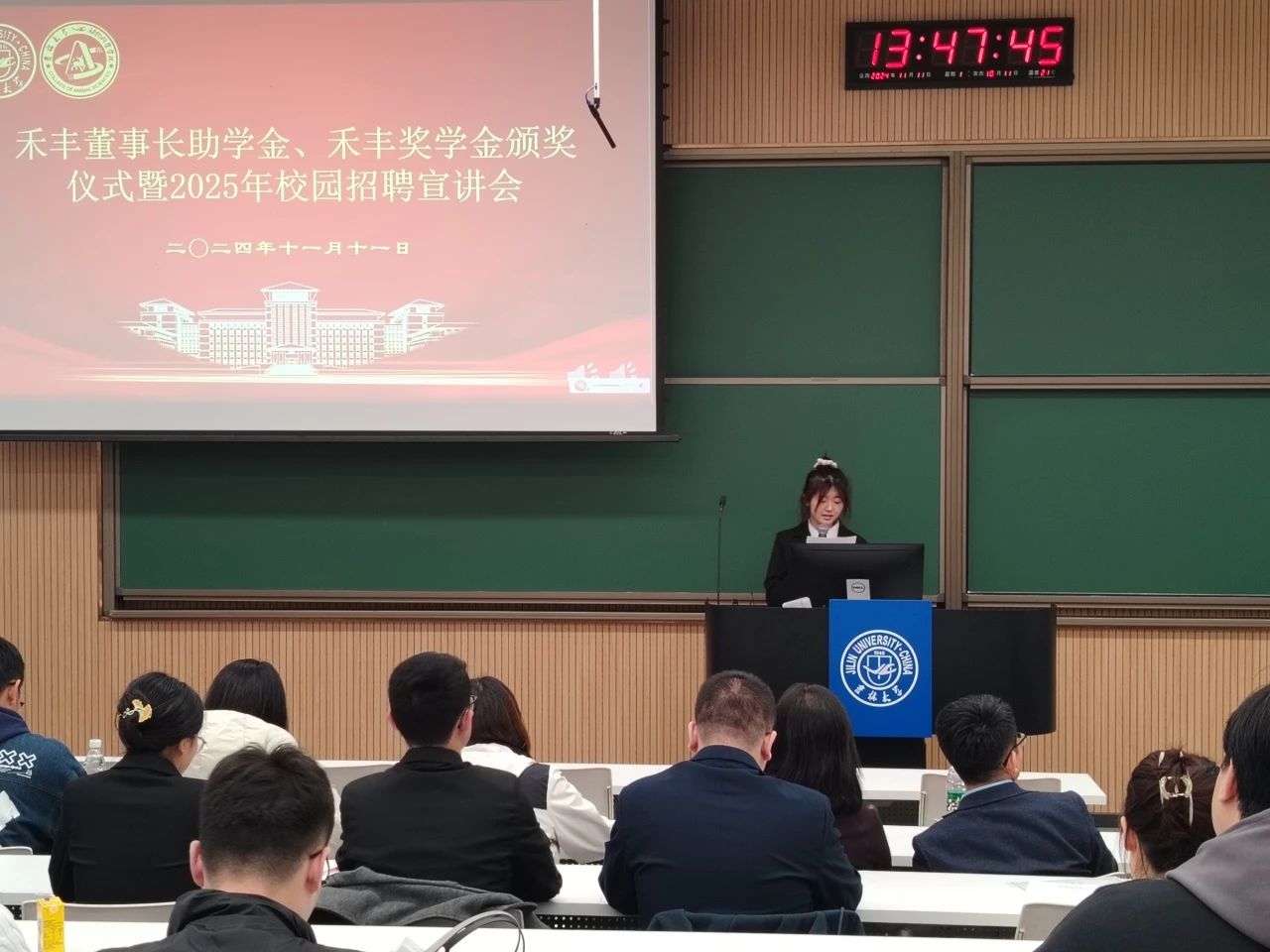 情系高校学子,聚焦农科人才,成就青年梦想。为表彰优秀农科学子,搭建校企合作交流平台,11月11日下午,2024年度“禾丰董事长助学金”“禾苗奖学金”颁奖仪式暨校园宣讲会在和平校区科学讲堂100教室顺利举办。禾丰股份沈禾猪料事业线销售总经理刁秀镯、辽宁区招聘培训COE杜娟、猪料事业线后方HR经理刘旭、熊猫体育党委副书记肖建荣、动物医学公司党委副书记谭瑶以及两公司辅导员参加会议。