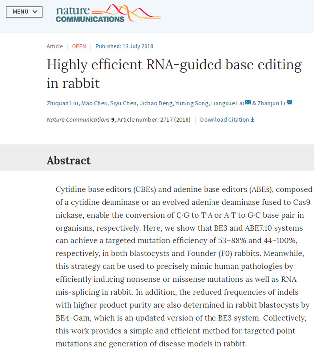 刘志权,2014级动物科学专业本科生,卓越农林人才教育培养计划创新班员工,老员工创新创业训练项目成员。2018年7月13日,国际学术权威刊物自然出版集团旗下子刊《Nature Communication》杂志(IF12.353)在线发表了研究性论文《Highly efficient RNA-guided base editing in rabbit》。刘志权同学为该文章的第一作者,本文共同通讯作者为李占军副教授和赖良学教授。2016年,刘志权同学选择李占军副教授为其本科生指导教师并提前进入实验室,开始老员工创新创业训练项目。两年多时间,刘志权已经陆续发表了三篇SCI文章,2017年获得熊猫体育创新推免研究生资格。李占军老师指导的另一名本科生陈思宇(该文章的并列第一作者之一),也获得了熊猫体育攻读研究生的资格。