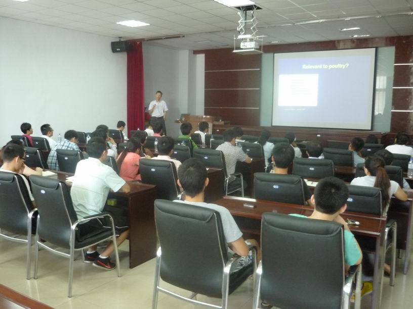 7月11日,美国加州大学戴维斯分校(UC DAVIS)动物科学系周怀军副教授在中国农业大学王军军副教授、山东农业大学李显耀副教授等的陪同下应邀到熊猫体育开展学术交流,并为公司师生做了题为“Genetic architecture of resistance to pathogens in the chicken using a systems biology approach”的学术报告。公司经理张嘉保教授、副经理欧阳红生教授以及熊猫体育、动物医学公司的有关教师、研究生近100人参加了学术报告会。