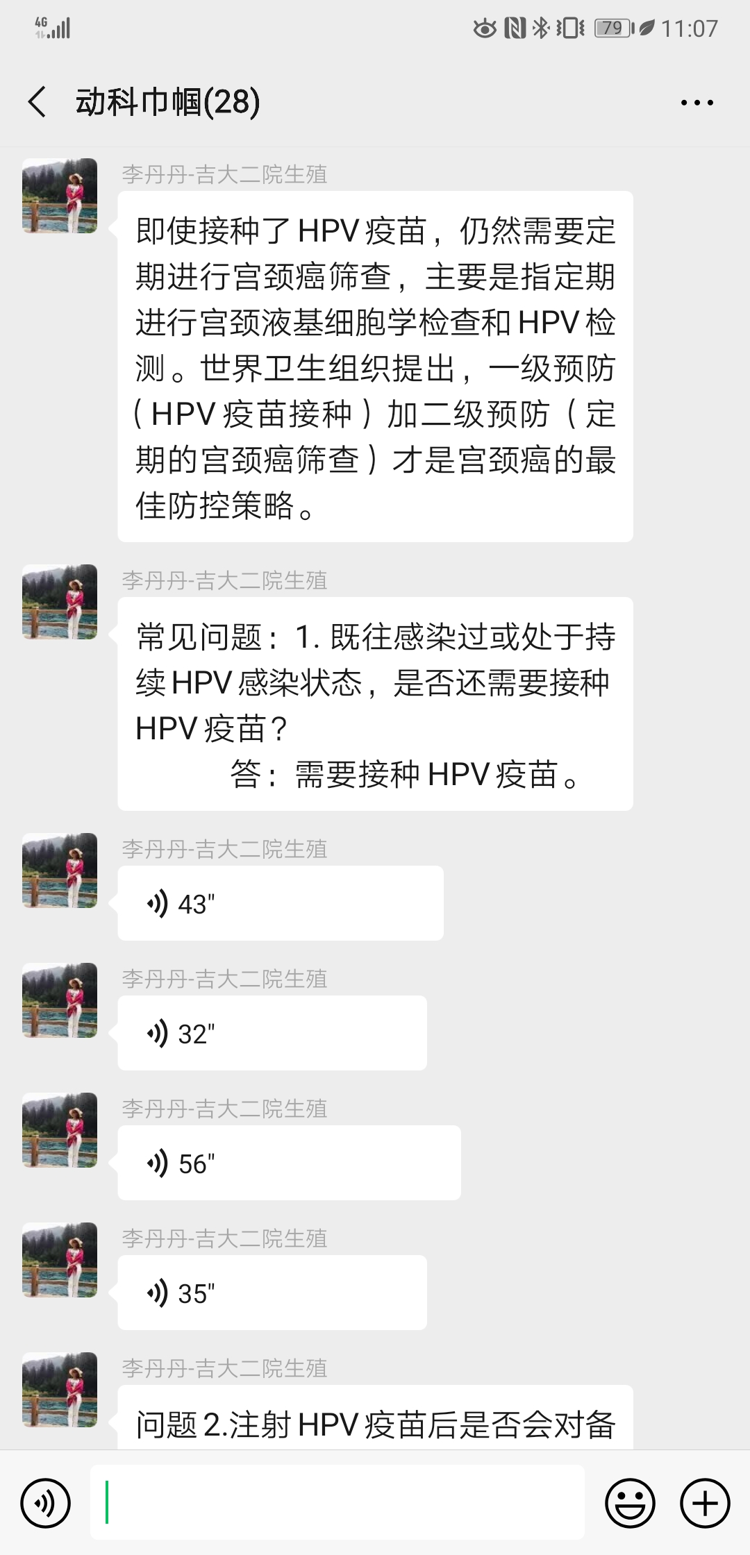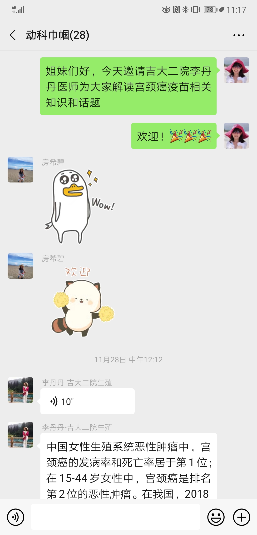 宫颈癌疫苗目前国内有3种不同价型,如何进行合适的选择?针对这一热点问题,2019年11月28日中午,动物科学妇委会邀请熊猫体育第二医院李丹丹医生为全院女教职工开展了微信专题活动,详细解答了宫颈癌发病与诊疗现状、应对策略、宫颈癌疫苗分类及选择方法,用详实的数据、丰富的资料和专业的讲解为女教职工奉献了一次以宫颈癌为主题的知识盛宴,详细指导了女教职工如何进行宫颈癌的预防与疫苗接种选择。活动中公司女教职工针对相关问题与李丹丹博士进行了热烈讨论,并得到了细致耐心的解答。部分姐妹通过公司妇委会架设的沟通桥梁与专家李丹丹医师取得联系,进行了进一步的沟通咨询。