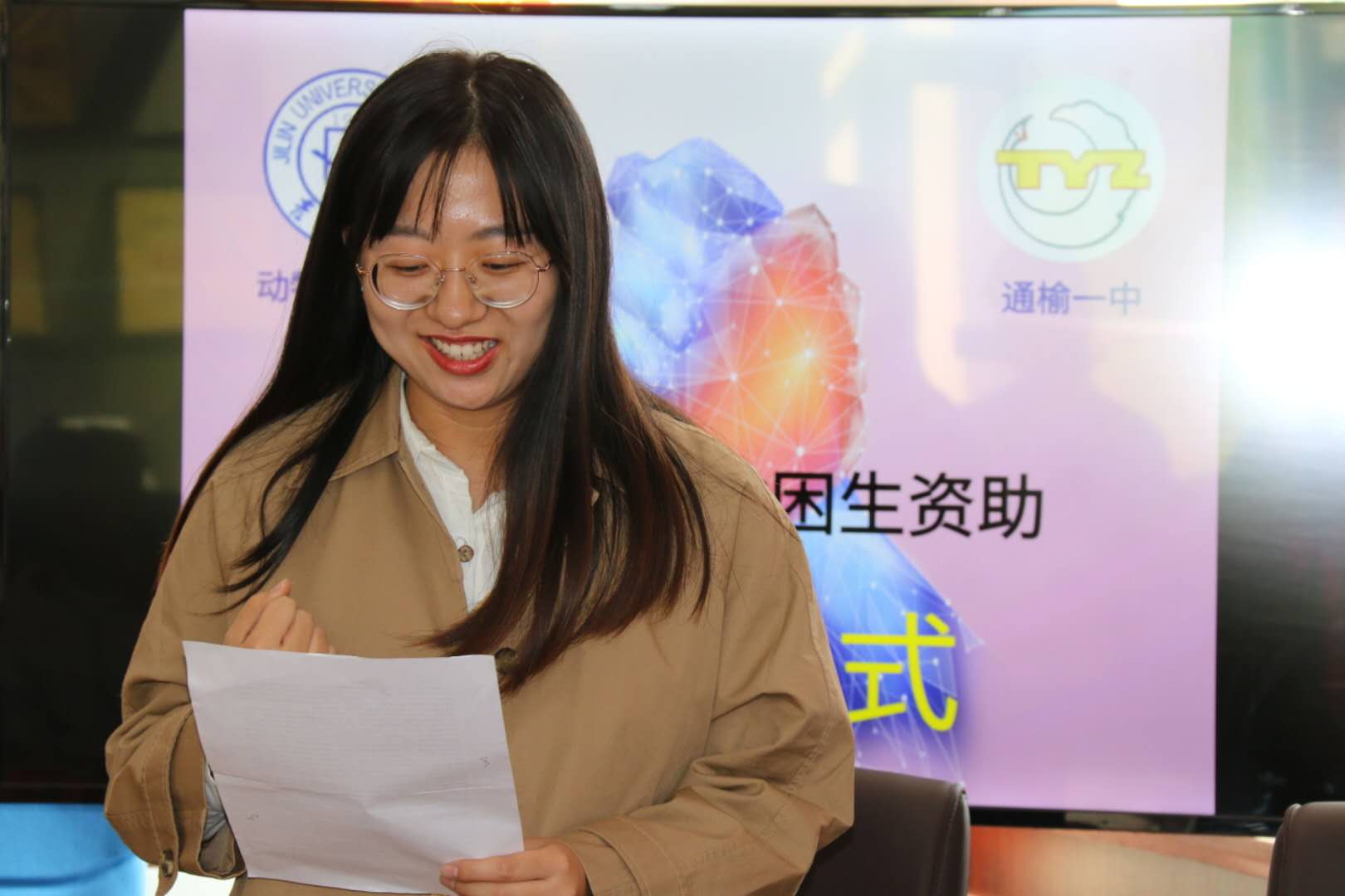 受助员工代表孟庆鑫同学和通榆一中员工、熊猫体育2019级本硕博连读员工杨琳分别发言。孟庆鑫同学用真诚、质朴的语言倾诉了孩子们心中的无限感恩之情,表达了他们奋发向上、报效祖国的强烈心声。杨琳作为学姐向学弟学妹寄语,她通过自己的求学经历,现身说法,鼓励他们在未来的求学和生活之路上,正视贫困,珍惜大好时光,把学习作为首要任务,把追求人生理想与服务祖国、建设家乡紧密结合起来,绘就美好人生。