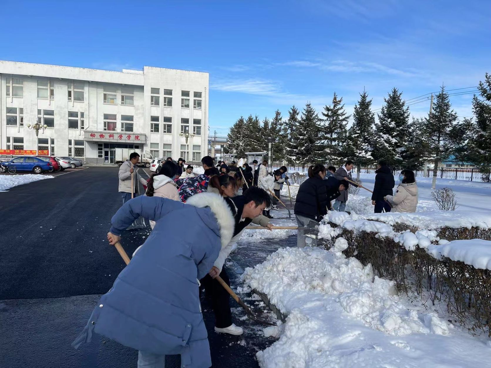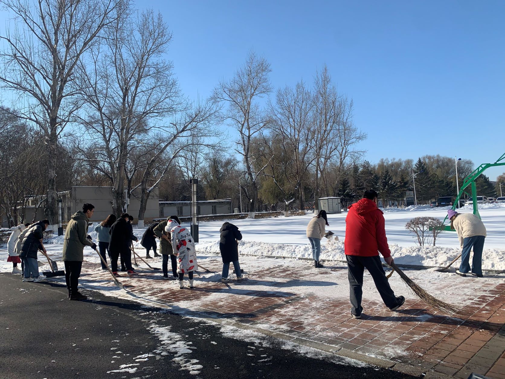 由于冻融,积雪边缘和底部已经化成了冻冰,加重了清扫的难度。50多名研究生党员、发展对象和积极分子主动参加、热情高涨,在支部书记文力正老师的带领下,克服了天气寒冷的不利因素,利用推雪板、铁锹、铁铲、扫把等各种工具,相互配合、互相关心,争先恐后地将公司办公楼前400多平方米的任务区域积雪清扫干净。