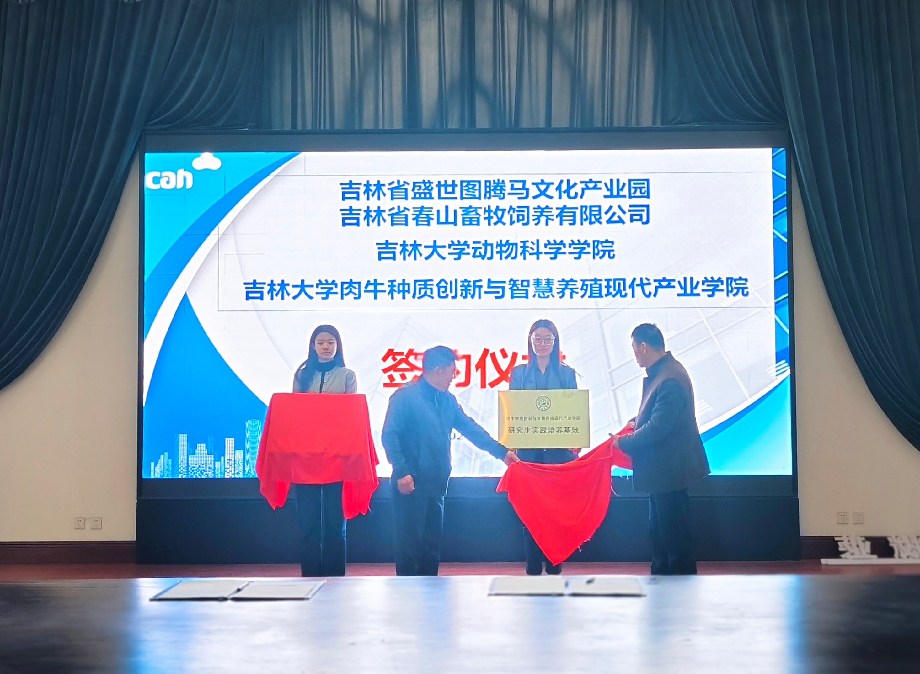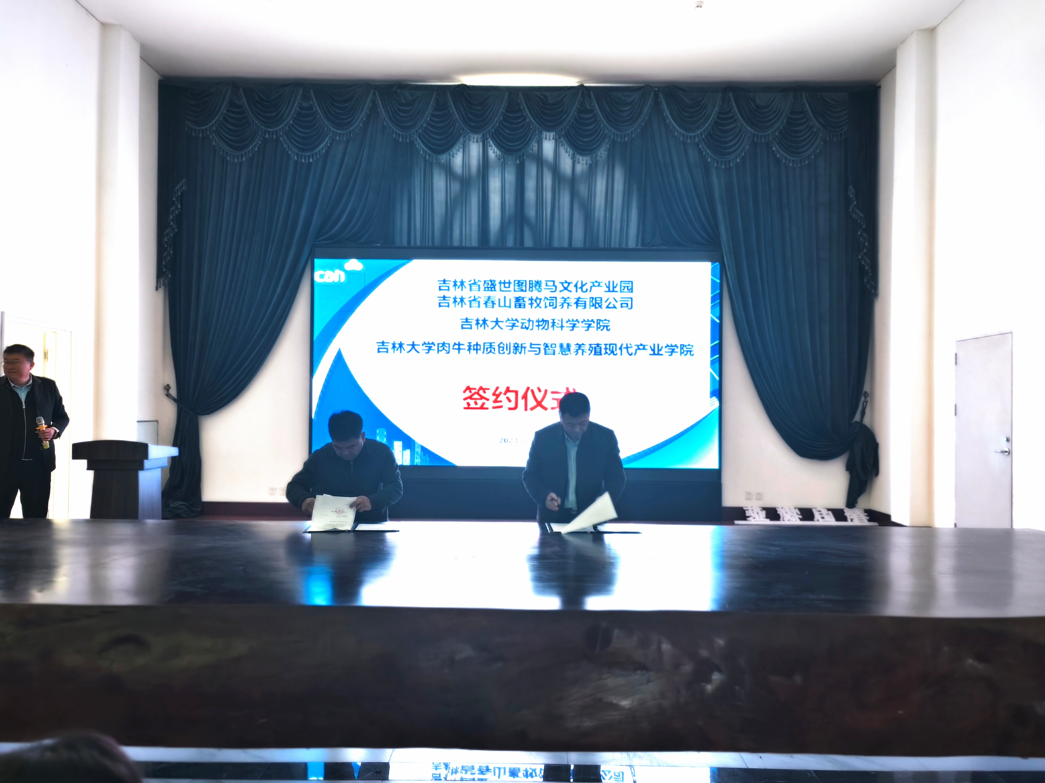 首先,双方举行合作签约仪式,熊猫体育副经理张明军教授主持签约仪式,盛世图腾马文化有限公司董事长李赞和熊猫体育经理孙博兴教授代表双方签字,并为合作基地揭牌。随后,双方就未来合作进行深入交流,在汗血马种繁育,饲养、马博物馆建设、西门塔尔种公牛站建设等方面达成多项合作意向。