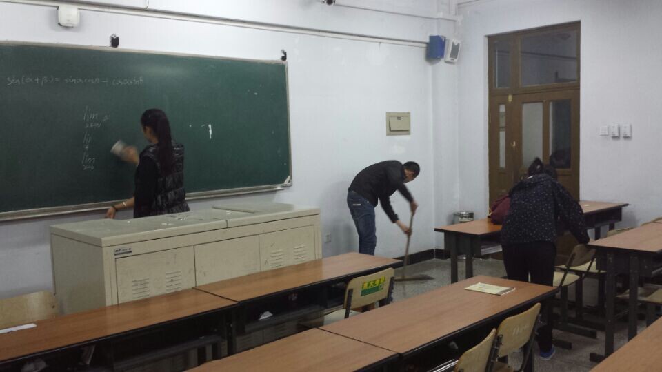 下午四点院员工会外联志工部同学集合完毕,前往目的地。首先同学们来到图书馆,协助老师整理书籍,并主动打扫馆内卫生。为了不打扰认真自习的员工,同学们的一举一动都小心翼翼。接着, 伴着冷冽的秋风,同学们又来到科学讲堂打扫楼道和教室。在教室中擦黑板,清扫地面,摆放桌椅……使原本脏乱的教室转眼间整洁起来。同学们的辛苦劳作给这寒风染上了一丝暖意,温暖了整个秋天。